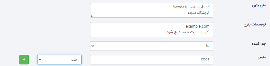 5- در کادرهای مربوط به متغیرها دقیقا به تعداد متغیرهای متن پیامک کلمات انگلیس را که استفاده کردید وارد کنید مثلا اگر متن پیامک شما دو متغیر name و orderid دارد دو کادر برای این دو کلمه ایجاد کنید.